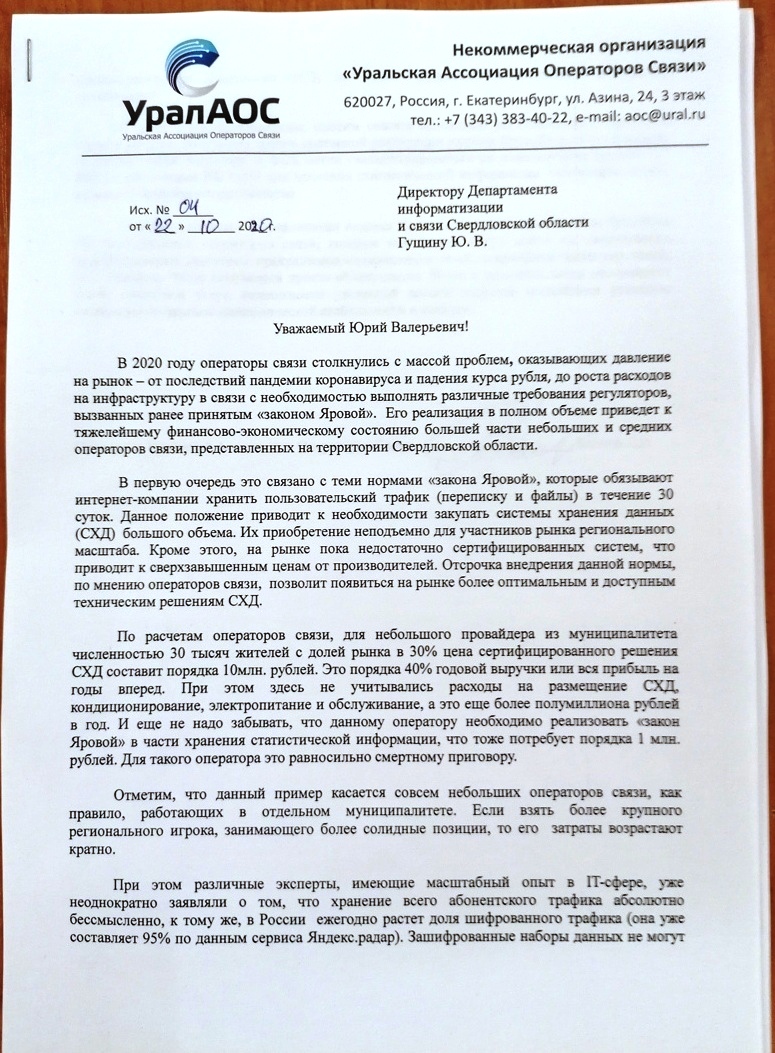 Региональные операторы связи обратились с открытым письмом к руководству Департамента информатизации и связи Свердловской области с просьбой оказать содействие в вопросе увеличения сроков поэтапной реализации «закона Яровой» в части хранения контента, чтобы операторы и ФСБ могли сконцентрироваться на модернизации технических средств оперативно-разыскных мероприятий на сетях связи и информационных систем для обеспечения функций ОРМ и хранения статистической информации.