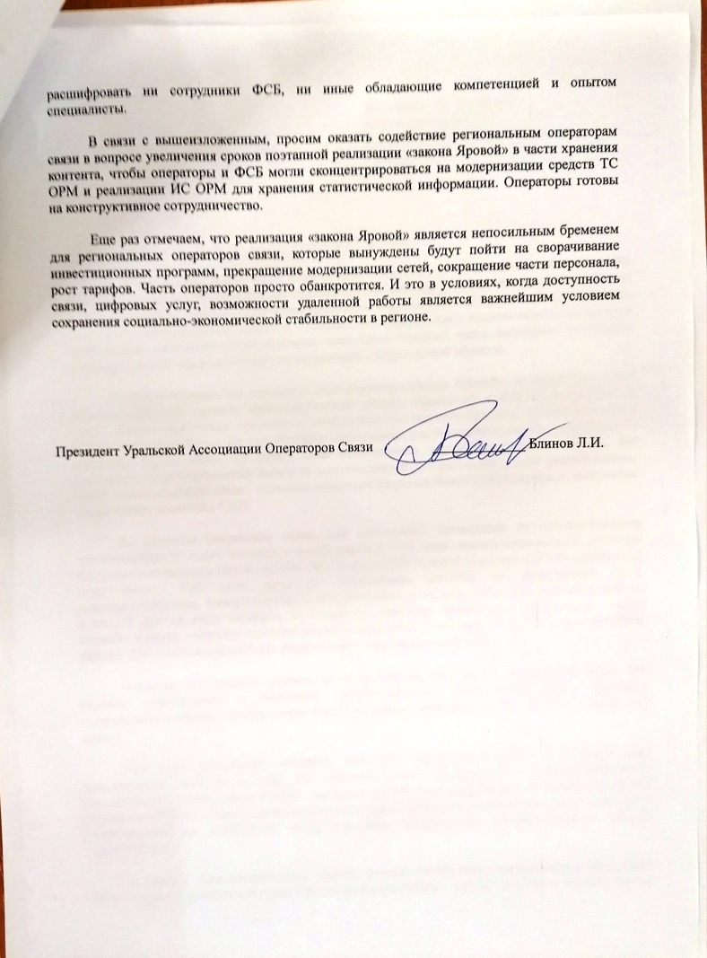 «Еще раз отмечаем, что реализация «закона Яровой» является непосильным бременем для региональных операторов связи, которые вынуждены будут пойти на сворачивание инвестиционных программ, прекращение модернизации сетей, сокращение части персонала, рост тарифов. Часть операторов просто обанкротится. И это в условиях, когда доступность связи, цифровых услуг, возможность удаленной работы является важнейшим условием сохранения социально-экономической стабильности в регионе», – резюмируют операторы связи.